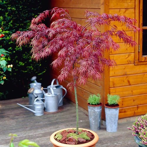 This gorgeous fine-leaved selection of weeping Japanese Maple makes a wonderful feature or specimen plant. Never taller than a small tree, it is slow growing, and makes a super focal point, forming an upright mound of cascading branches.