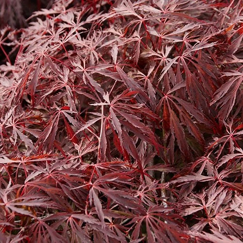 Acer palmatum ‘Inaba-shidare’ is a small, slow growing, deciduous shrub with arching branches of purple filigree leaves, which puts on a spectacular, vivid scarlet show in autumn, making it ideal as a focal point in a small garden.