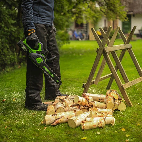 The Greenworks GD24CS30 is a robust, lightweight 24V chainsaw designed for home and DIY tasks. Powered by an advanced 24V lithium-ion battery, the chainsaw offers high performance despite its compact size. Convenience is guaranteed with no fuel or electric cables to contend with, simply insert the battery and you are ready to cut.