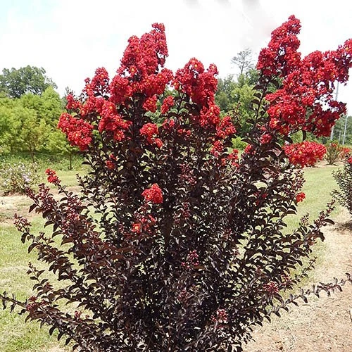 This crepe Myrtle will light up your garden with its incredible crimson red blooms that will smother it in summer and autumn, attracting bees and butterflies into your garden to feast on the fabulous flowers. The large and frilly eye-catching blooms contrast effortlessly against this crepe Myrtle’s gorgeous black foliage. Your Lagerstroemia will put on a spectacular show for most of the year and will really grab the attention of everyone who sees it.
